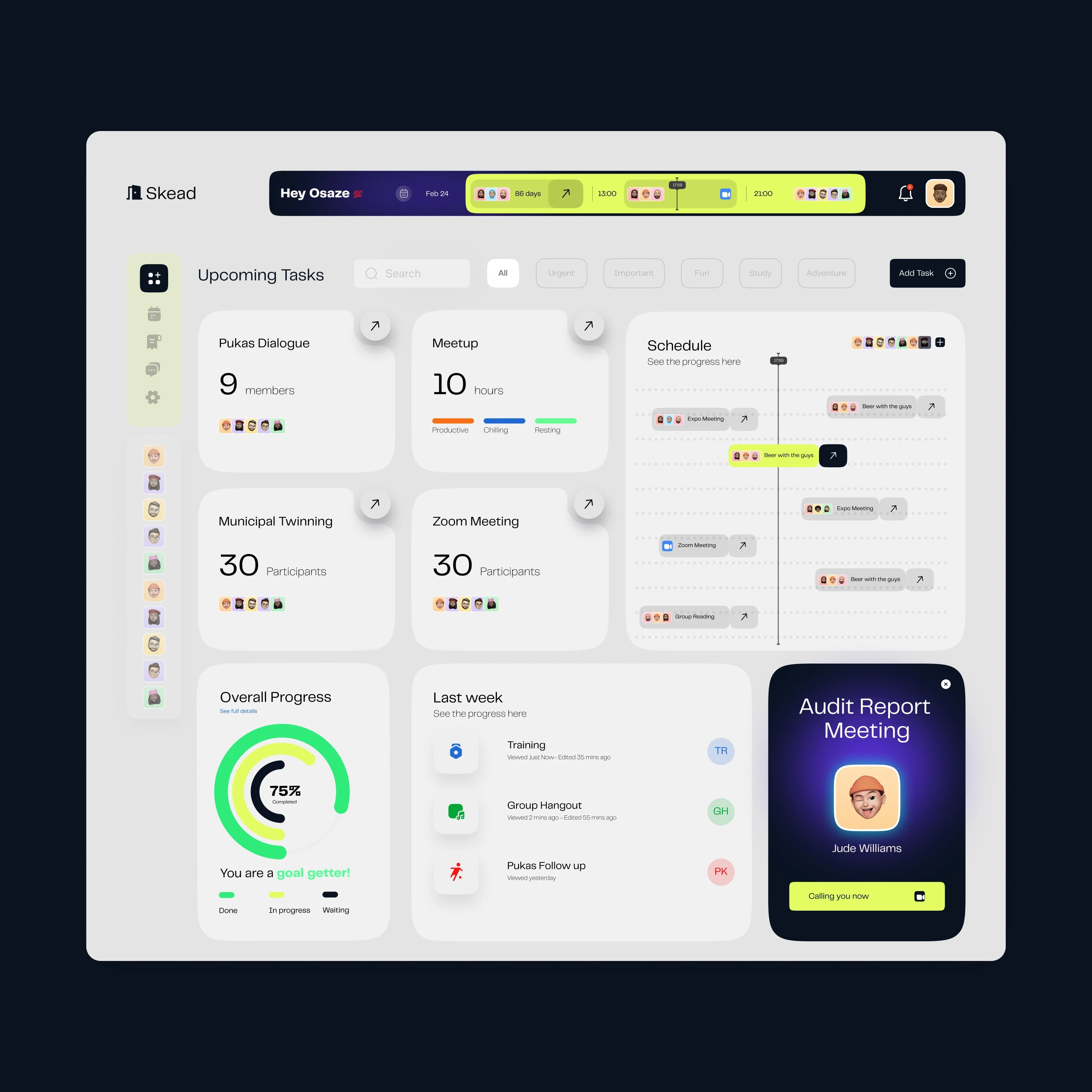 模塊化卡片布局 —— 信息拆分為獨立卡片,任務、進度、日程分區清晰。