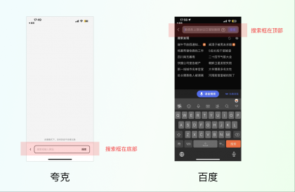 又比如說手機(jī)瀏覽器一般都把搜索框放到屏幕頂部,而夸克瀏覽器卻把搜索框放到了下面。