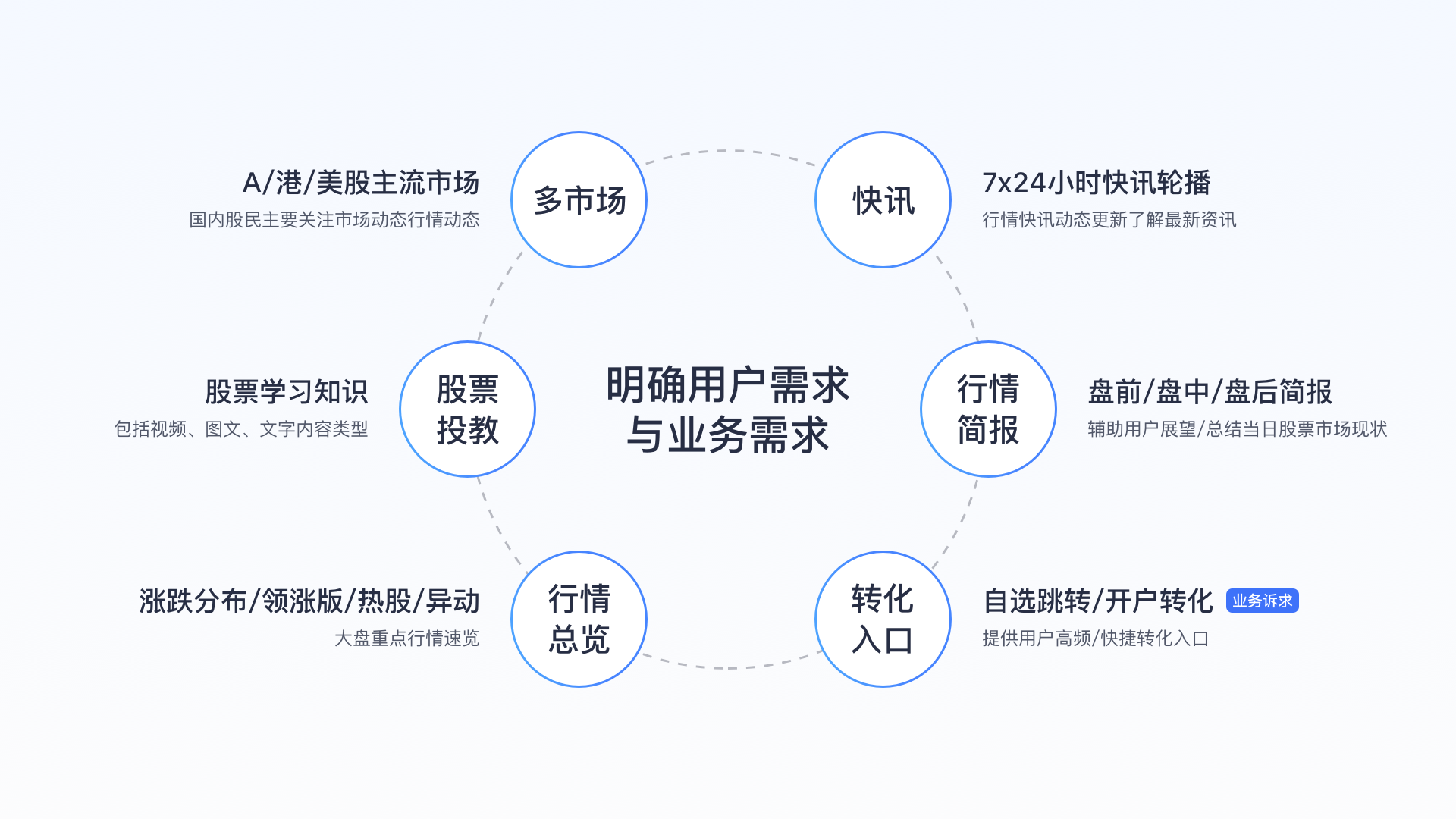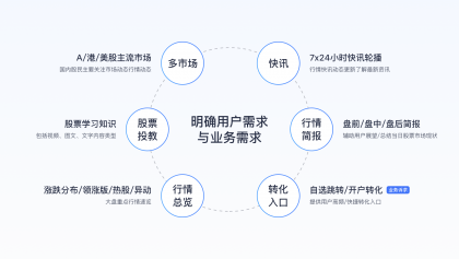 用戶需求:結(jié)合用戶高頻使用功能分析發(fā)現(xiàn)小白用戶、一般散戶、專業(yè)用戶均對行情功能有高頻率的使用需求,具體需求包括了解多市場、關鍵指數(shù)行情、了解最新快訊、重要行情動態(tài)、盤前/盤中/盤后簡報,再結(jié)合小白用戶占比高且對百科內(nèi)容有需求的現(xiàn)狀,知識科普信息也是相關待滿足需求。