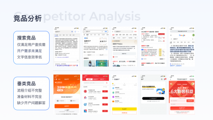 競品分析:搜索競品包括今日頭條、夸克、QQ瀏覽器、必應、谷歌均以滿足用戶查找需求為主,信息以純文本形式展現(xiàn),消費成本較高,且未滿足用戶潛在的開戶需求,垂類競品開戶頁對流程、材料介紹均不完整、缺少完整的介紹及問題解答。