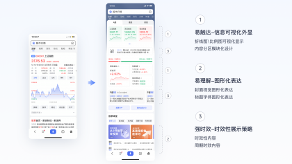 基于小白用戶經(jīng)驗少、金融垂類專業(yè)知識多晦澀難懂、數(shù)據(jù)復雜難理解的背景,制定易觸達、易理解2個策略,通過信息可視化外顯、圖表圖形化表達、關鍵信息外顯等方式降低用戶消費門檻,提高信息獲取效率,強時效是基于股票特有的盤前/盤中/盤后周期性交易特征擬定的,可通過此特征打造更加差異化的滿足。