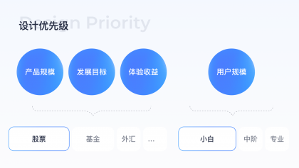 由于開發(fā)資源有限,不能一次做完所有產(chǎn)品設計優(yōu)化,因此需針對優(yōu)化內(nèi)容排布優(yōu)先級,對高優(yōu)場景進行優(yōu)化,這里的方法是結(jié)合用戶分類規(guī)模、產(chǎn)品品類規(guī)模、發(fā)展目標、體驗收益高低明確優(yōu)化優(yōu)先級,通過上述精細化分析得出結(jié)論股票場景用戶規(guī)模大,且小白用戶占比高,因此在股票場景下針對偏小白用戶高優(yōu)進行設計優(yōu)化。
