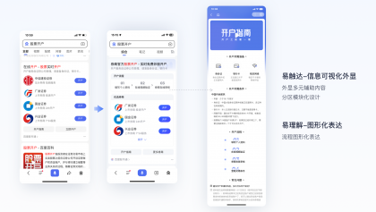 策略設計 :結(jié)合用戶需求優(yōu)先級對信息模塊進行分區(qū),可視化外顯優(yōu)先滿足開戶流程需求,再提供優(yōu)質(zhì)券商開戶入口,考慮到搜索結(jié)果頁卡片展示屏效,完整開戶指南配合在落地頁內(nèi)呈現(xiàn)。
