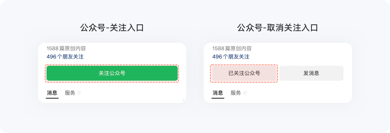 有時候,出于商業化的目的,同一個選項在二次操作時,產品會刻意增加用戶操作成本,以降低選擇效率,看似希克定律的反向操作,卻一定程度地降低了用戶退出率,實則對產品有益。例如,在關注微信公眾號之前,非常醒目的關注按鈕觸手可及,可關注之后,弱化的幽靈按鈕及文案,很難一眼看出這就是取消關注入口,需要用戶花費額外的時間去理解或試錯方可取關,這么做能降低公眾號粉絲的取關量。為公眾號留住粉絲,更是對內容認可的一種支持,后面的良性循環無需多講。