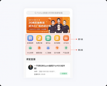 在設計過程中,如果沒有對功能層級進行劃分,一股腦地將所有功能入口平鋪的話,就需要用戶花費大量的時間和精力來查找需要的功能,無疑是一場災難。我們可以通過希克定律來優化界面功能布局,根據業務的重要性對功能入口進行分類組合,減少用戶的認知及理解成本,以便快速達到目的。