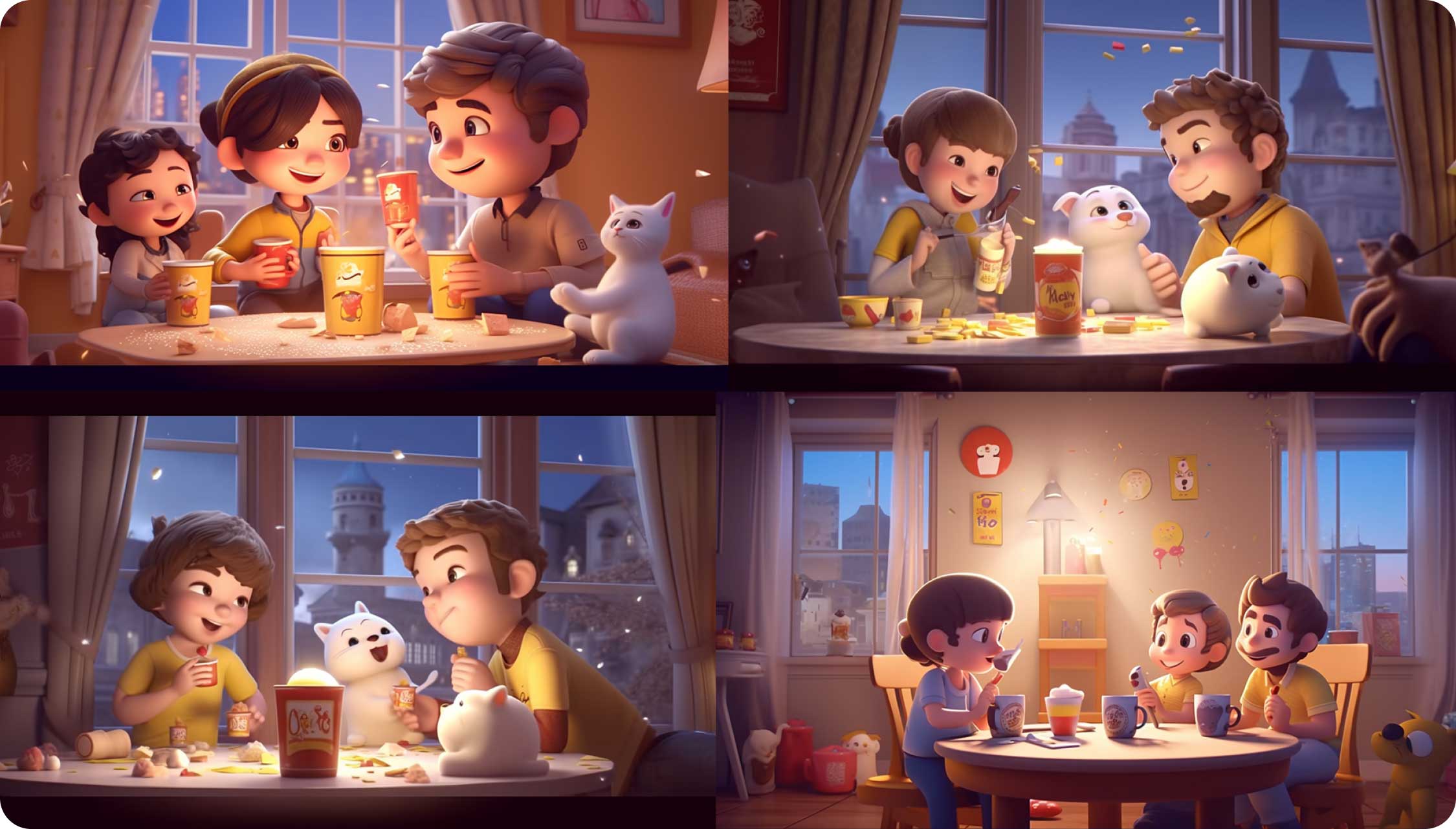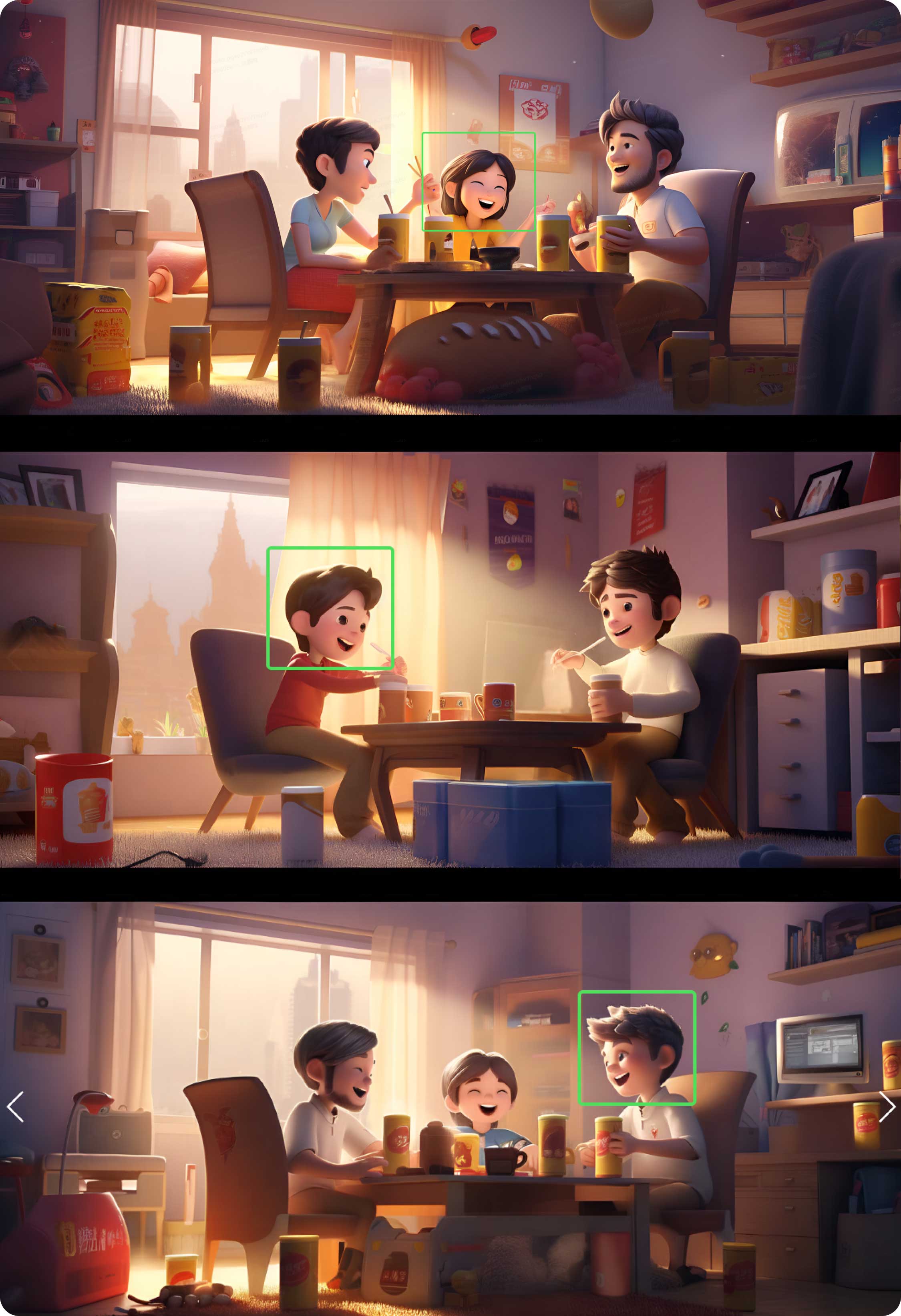 在前期,我們對構(gòu)想的畫面進(jìn)行關(guān)鍵詞的描述:“可愛帥氣的男女孩子們一起玩手機(jī),開心地微笑著,舉起手歡呼,溫暖的房間,大型落地窗。”將關(guān)鍵詞翻譯后放入Midjourney中進(jìn)行煉圖,最終篩選了幾張氛圍還不錯的進(jìn)行下一步操作。