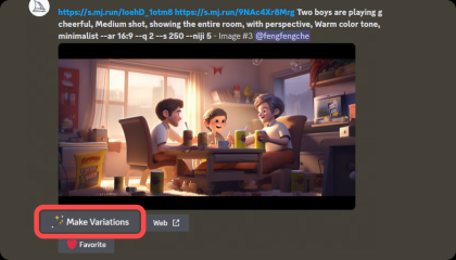 得到這張圖后,覺得畫面左上角部分有些空白,為了襯托歡快聚會的氛圍,我們決定在左上方加上掛旗。方法也是運(yùn)用Midjourney的混音模式。在關(guān)鍵詞中加入“屋子里掛著彩旗”。
