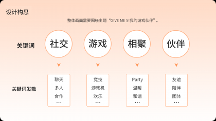 需求方希望畫面能展現(xiàn)出品牌的社交感,以“游戲伙伴”為主題,畫面表達(dá)各種不同類型游戲伙伴,因我們的產(chǎn)品而相聚的場景。同時(shí)希望畫面中的人物能做出擊掌(GIVE ME 5)的動作,以此呼應(yīng)品牌發(fā)布會的主題。