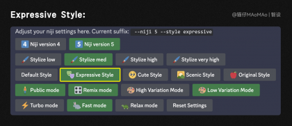 因為是單個元素生成,背景環(huán)境關(guān)鍵詞可以省略,大家在編寫關(guān)鍵詞時,注意靈活增減,不用一定按照所謂的公式來寫,藝術(shù)風(fēng)格是插畫素材,我們直接使用niji模型,其中expressive風(fēng)格會讓插畫更加富有表現(xiàn)力,可以直接在關(guān)鍵詞后面加上后綴“--style expressive ”,或者用“/settings”命令,更改設(shè)置。
