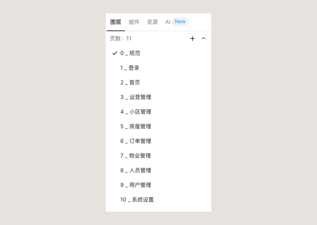 Page 就是軟件左上的畫布列表,一個項目如果頁面多,就一定要用 Page做拆分。而在我們當前的場景中,就可以根據交付的模塊階段劃分,每個模塊創建一個 Page,這樣開發在本次項目中只需要查看這個源文件就可以。
