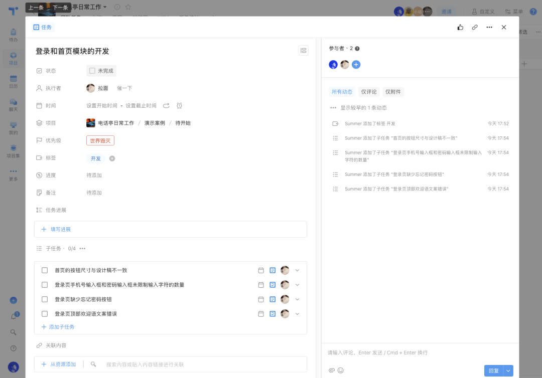 添加任務時,可以用標簽或標題前綴,來區分設計還是開發的任務。這個創建的過程盡量在前面說到的共識建立的溝通會議中進行,并對每個任務內添加實現的目標和水平,以及對應的負責人。