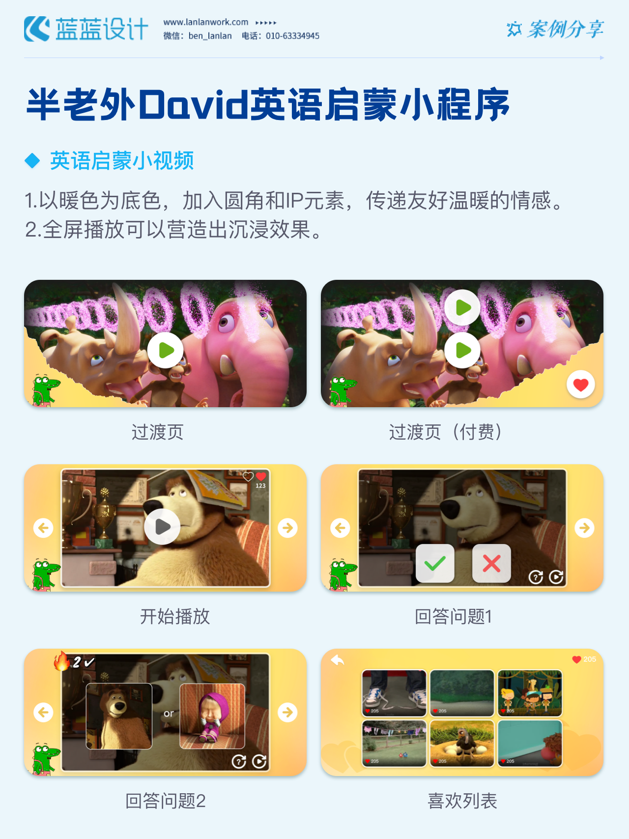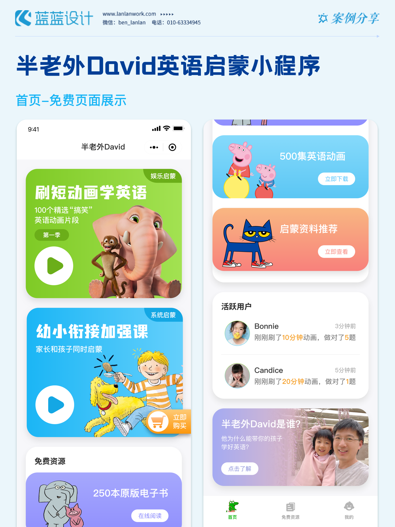 藍藍設計負責半老外David英語啟蒙小程序的界面整體風格和細節優化工作,也包括圖片優化等諸多視覺內容。前期雙方通過不斷溝通和深入了解最終確定了頁面的風格樣式??匆曨l學英語的方式更容易為孩子所接受,頁面的簡潔風格和顏色應用更加吸引兒童。