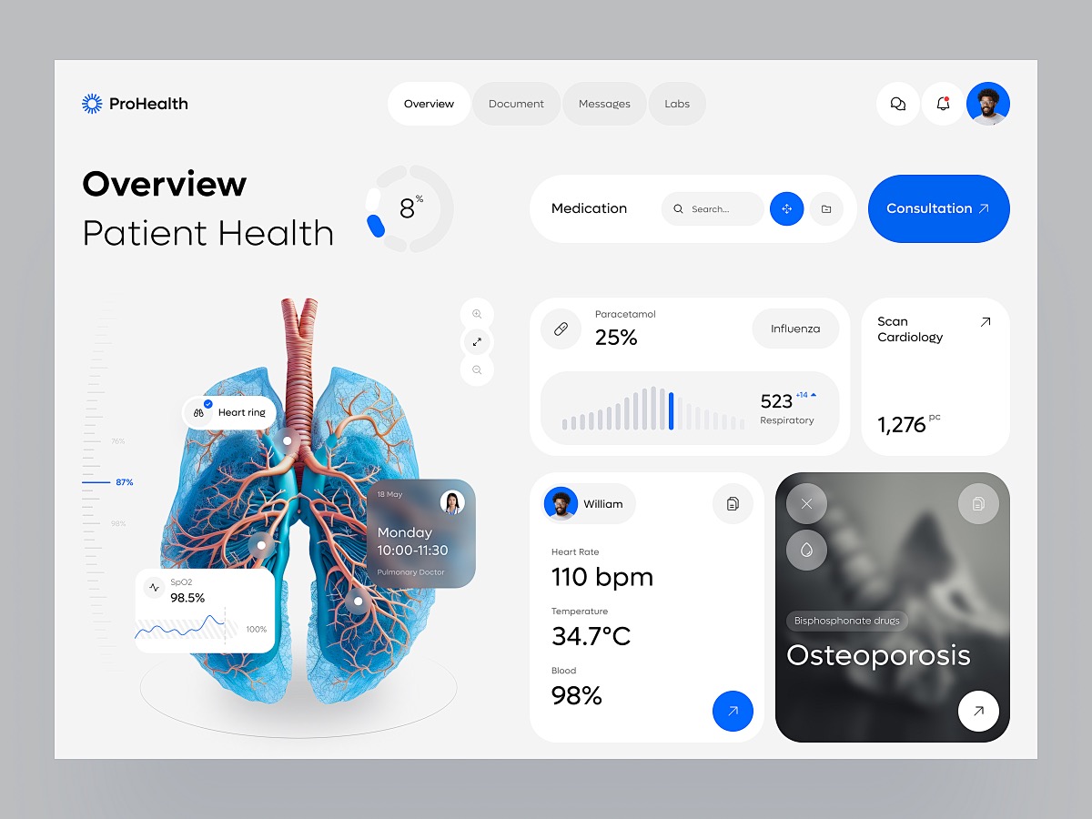 針對患者的醫療 UI 設計,功能重點在于信息查詢與服務獲取?;颊咝枰軌蚍奖愕夭樵冏约旱木驮\記錄、檢查報告、費用明細等信息,因此在患者端的醫療 APP 或醫院官網界面上,應設置專門的信息查詢入口,并以清晰易懂的方式呈現數據。同時,提供在線預約掛號、繳費、藥品配送等服務功能,實現就醫流程的線上化,減少患者排隊等待的時間。此外,一些健康管理功能也受到患者的歡迎,如個人健康檔案管理、疾病預防知識推送、康復訓練指導等。