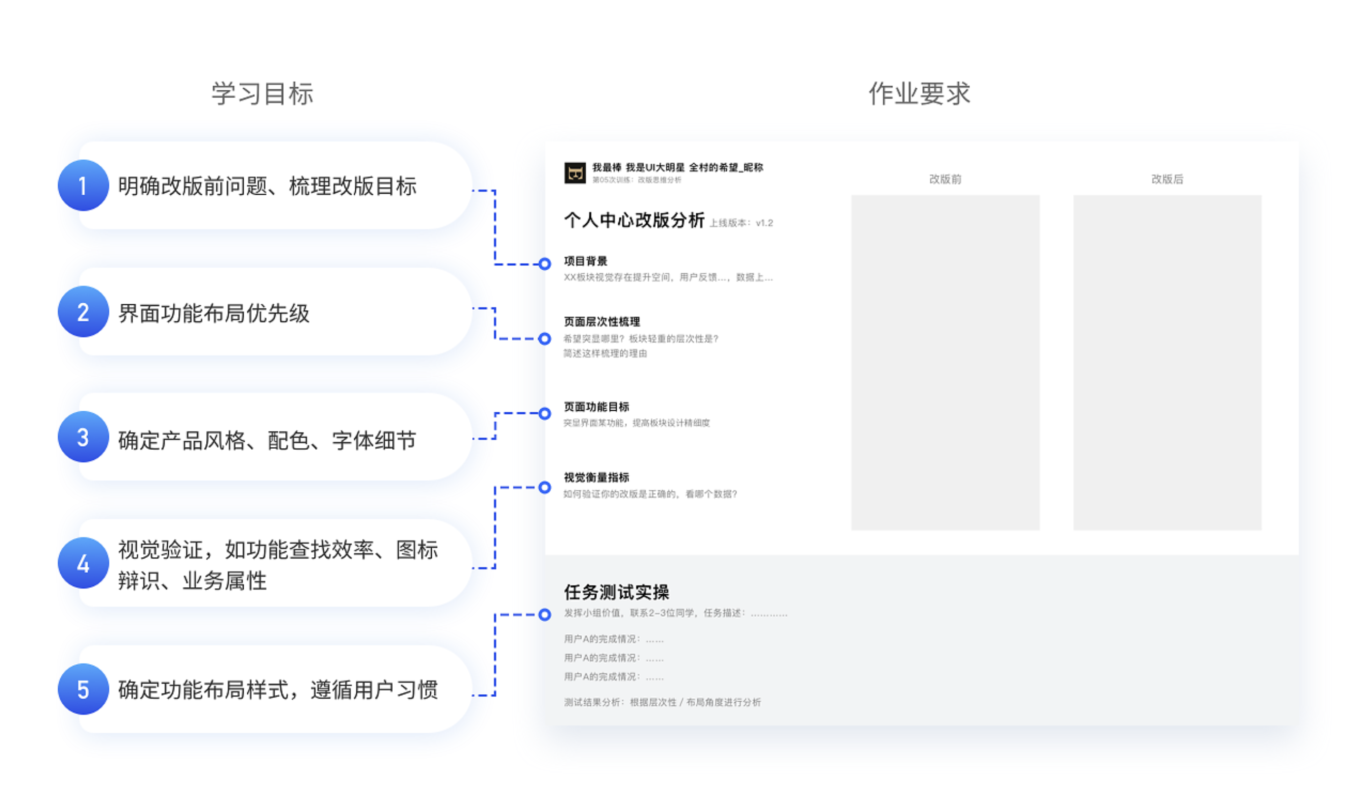 • 科學的作業體系包括明確改版前的問題、梳理改版目標、確定頁面層次性和功能目標、進行任務測試等,從每次作業中培養設計思維。