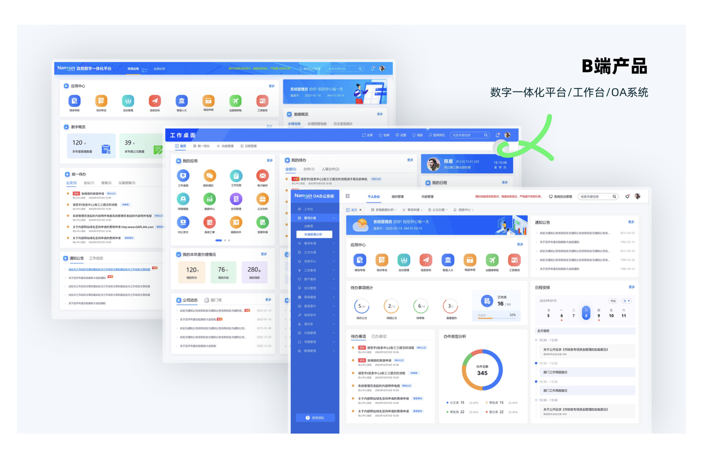 • B 端 UI 設計:全稱 “To Business”,服務于企業或組織用戶,核心是滿足商業流程需求。比如 OA 辦公系統、財務軟件、數據監管平臺等,設計目標是幫企業優化流程、降低成本、提升生產力。
