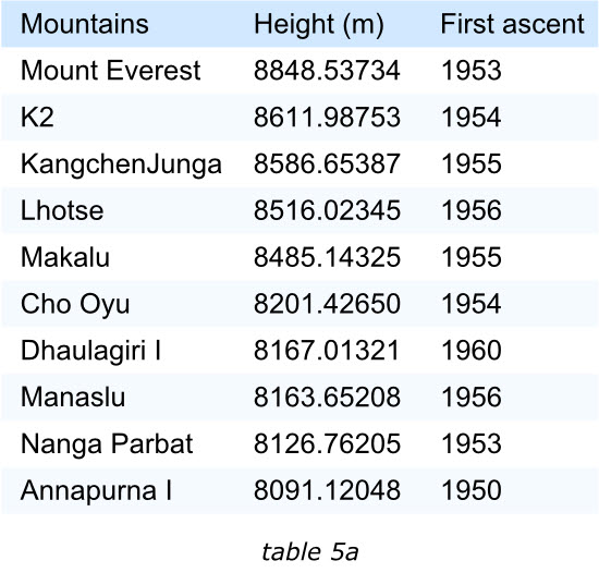 例如:找到最接近8500米的山峰,第二章表格要遠(yuǎn)比第一個表格容易。山的高度到毫米顯然沒有必要,他使得讀者誤認(rèn)為這些數(shù)據(jù)的確是經(jīng)過精準(zhǔn)測量,然而事實有可能不是這樣。根據(jù)讀者的需要提供數(shù)據(jù)的準(zhǔn)確程度,并不會削弱數(shù)據(jù)的有效性。當(dāng)然又少部分人會質(zhì)疑第二章表格的準(zhǔn)確性,但是大部分人會想山峰的高度能夠被測量的如此嗎?(山峰每年移動的距離就遠(yuǎn)不止于此),甚至還會對從整體上對數(shù)據(jù)的有效性以及及時性提出質(zhì)疑。