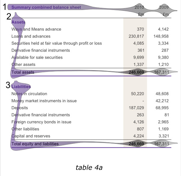 下面的英格蘭銀行2010年年報的一組信息被分成了兩個表格,但仍然體現(xiàn)為一個整體。紫色的表頭清晰的給出了標(biāo)題,標(biāo)題行僅用了一次表頭(2009、2010)和單位(英鎊)。兩個表格采用同種顏色加粗的字體作為標(biāo)題,清晰而相互獨立。兩表各自的最后一行也采用了同樣顏色的下劃線。