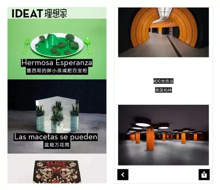 IDEAT理想家App,繼承了法國(guó)IDEAT雜志的理念,以展示設(shè)計(jì)、藝術(shù)和風(fēng)尚的「當(dāng)代生活」內(nèi)容為主。App界面上除了內(nèi)容圖片之外,幾乎沒有黑白以外的其他色彩元素。通過襯以黑底的高亮白字,既是內(nèi)容又是裝飾,貫穿在整個(gè)App設(shè)計(jì)元素當(dāng)中;調(diào)節(jié)這些文字與其他內(nèi)容之間的間距,又在排版上起到作為點(diǎn),作為線,甚至作為面的不同功用。
