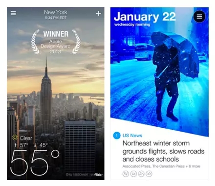 例如以設(shè)計(jì)精美著稱的Yahoo的兩款明星App產(chǎn)品Yahoo Weather!和Yahoo Digest。除了在產(chǎn)品設(shè)計(jì)上的和突出表現(xiàn)外,模糊和斜切的手法,給整個(gè)產(chǎn)品的品牌氣質(zhì)提升到了一個(gè)新的高度。 Yahoo Weather! 不論是在布局、字體和色彩的運(yùn)用上都顯得精致細(xì)膩,滑動(dòng)時(shí)高斯模糊的處理更是流暢平滑。Yahoo Digest 的斜切突出一個(gè)“破”,在不影響照片內(nèi)容的前提下,既能在視覺上顯得與眾不同,又在排版上巧妙地為色彩標(biāo)簽留了一角之地。比起一刀平,更顯靈動(dòng)而不失平衡感。