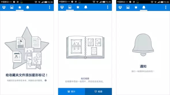 Dropbox是筆者非常喜歡的一款網絡文件同步工具,產品面臨的問題是需要引導用戶上傳內容。應用在用戶首次使用收藏、相冊及提醒功能時通過灰階加線條風格的圖示和淺白的文字說明告知用戶如何使用這三個功能,畫面在保持一貫品牌風格的同時也降低了用戶因為列表內空無一物而產生情緒上的挫敗感。