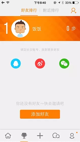 “樂動力”的好友排行頁面,在沒有添加過好友的情況下,該頁面展示了一些社交網絡的圖標和大大的添加按鈕提示用戶可以通過綁定社交賬號來找到更多好友一起PK運動量。