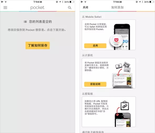 Pocket是一個可以讓用戶把內容(文字、圖片甚至視頻)一鍵保存下來,用于其他時間完成閱讀的工具。在初次使用時它的列表頁面內沒有內容時,會顯示一個“了解如何保存”的按鈕,點擊可以詳細了解添加列表的各種方法。