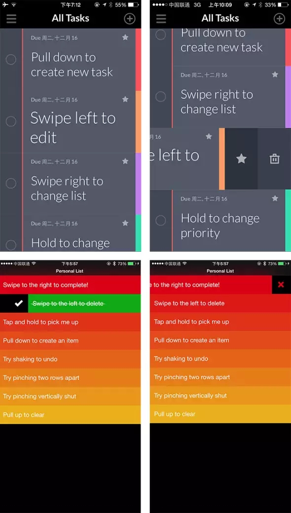 Taasky和Clear作為兩款交互優秀的任務應用,都擁有非常豐富手勢操作,它們沒有像別的軟件一樣在界面上加遮罩、標注做出冗長的用戶教育頁,而是直接將操作指引嵌在一條條的任務里,用戶只要跟著當前任務的簡單描述滑動屏幕就能了解全部手勢操作,即充實了原本空白的缺省頁面又很自然地指導用戶如何使用該軟件。