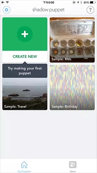 Shadow Puppet可以把照片和視頻剪輯結合聲音、貼紙等制作成動畫,制作簡單,被譽為視頻版的PPT。它的首頁預置了展示用的視頻樣本,用戶可以通過觀看視頻案例對Shadow Puppet的視頻制作有感性的認知。