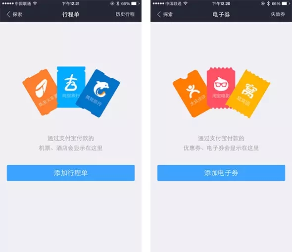 支付寶錢包的電子券和行程單頁面通過票據圖形+文字清楚地說明該分類下會出現什么內容,并在屏幕下方提供添加票據的按鈕。