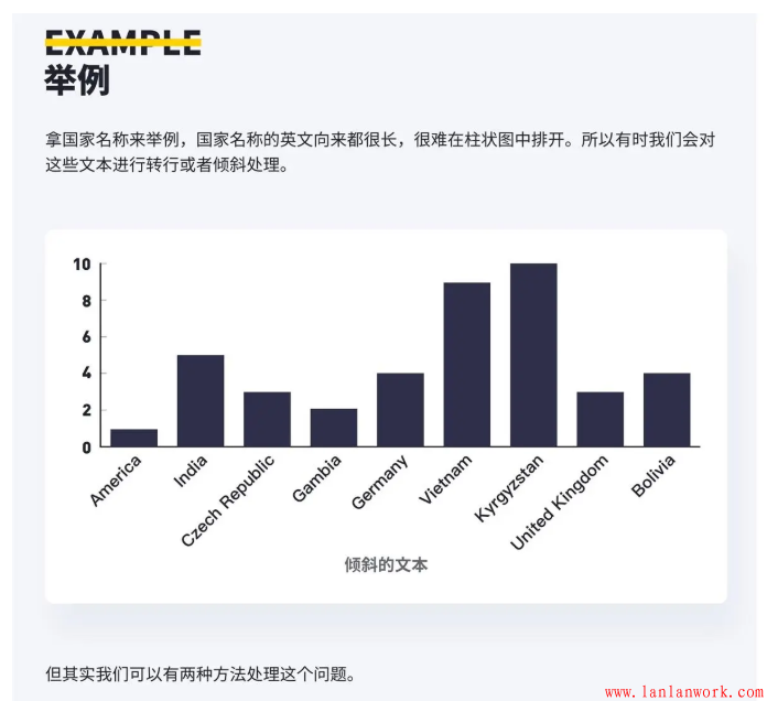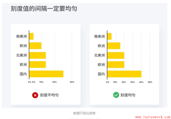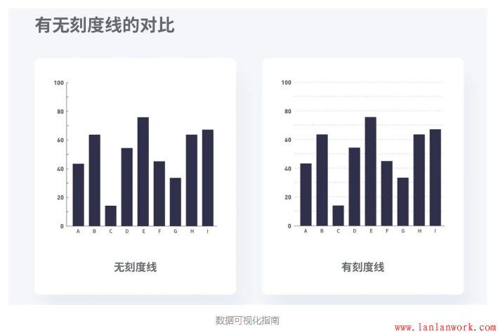 如果你的聽(tīng)眾只需要了解A數(shù)據(jù)大于B數(shù)據(jù),那么刻度線是沒(méi)有必要的,只需在坐標(biāo)軸上使用小刻度即可。如果你的讀者要花一些時(shí)間在柱狀圖上并感興趣A數(shù)據(jù)是45.65而B數(shù)據(jù)是37.66,那么使用刻度線將有助于他們理解。