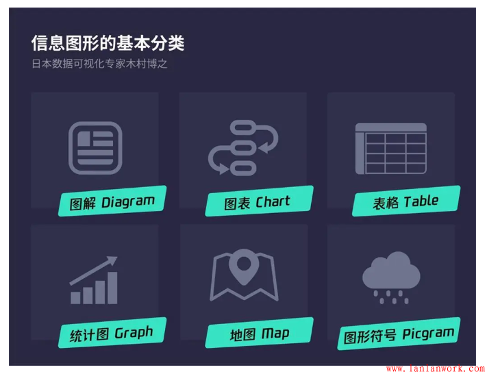 根據(jù)木村博之的定義,從視覺(jué)表現(xiàn)形式的角度,將「信息圖表」的呈現(xiàn)方式分為六大類:圖解(Diagram)、圖表(Chart)、表格(Table)、統(tǒng)計(jì)圖(Graph)、地圖(Map)、圖形符號(hào)(Pictogram)。