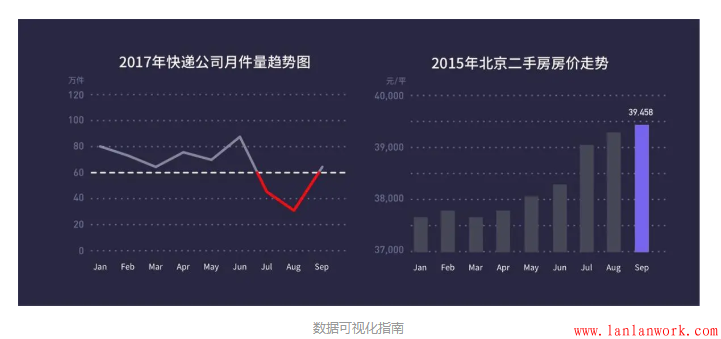 如上左圖,通過(guò)添加輔助線和標(biāo)紅的方式,來(lái)顯示快遞公司未達(dá)到60萬(wàn)件派件標(biāo)準(zhǔn)的月份,從而突出顯示公司業(yè)績(jī)不合格部分。如上右圖,通過(guò)對(duì)9月份的顏色區(qū)分,來(lái)突出顯示二手房?jī)r(jià)格在9月份達(dá)到前所未有的高度。