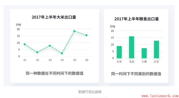 2017年1月和2月的大米出口量是相關(guān)的,他們代表一種數(shù)據(jù)在不同時(shí)間下的數(shù)據(jù)值,因此我們可以用折線圖將它們連接起來(lái)。但是2017年1月的大米出口量和玉米出口量(16萬(wàn)噸)是不相關(guān)的,所以我們不能隨便用折線圖來(lái)代替柱狀圖。