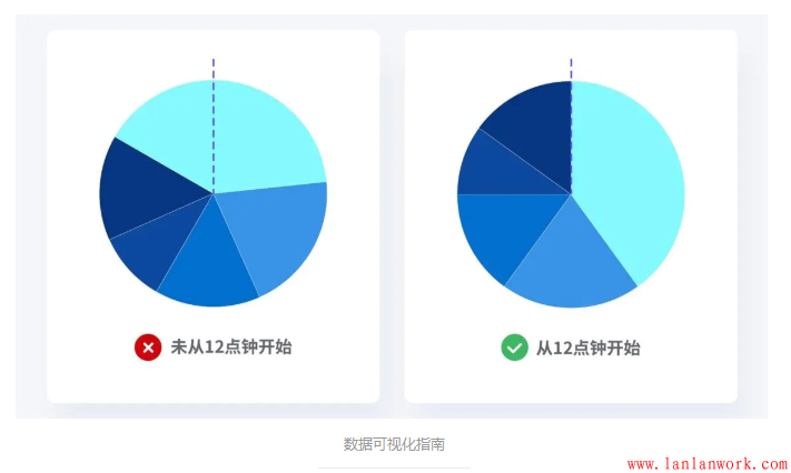 人們的閱讀習(xí)慣往往是從12點(diǎn)鐘開(kāi)始的(跟表盤類似)。所以我們?cè)谥谱黠瀳D時(shí)也要遵循觀眾的閱讀習(xí)慣,從12點(diǎn)鐘方向開(kāi)始制作,這樣才能呈現(xiàn)出更加清晰的數(shù)據(jù)。
