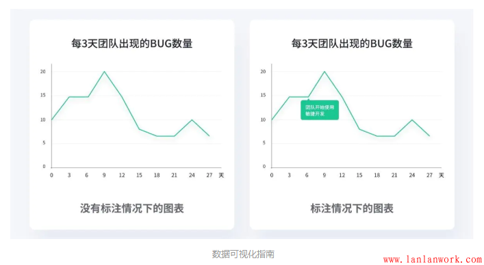 如果我告訴你,這個(gè)圖表想告訴我們,在第6天的時(shí)候該團(tuán)隊(duì)使用了敏捷開(kāi)發(fā),在使用新技術(shù)初期,Bug數(shù)量明顯上升,而后瞬間下降。加上了標(biāo)注,圖表講述了一個(gè)跟之前完全不一樣的故事。