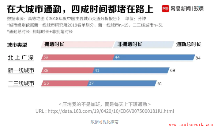 下圖是大城市通勤的時(shí)長(zhǎng)統(tǒng)計(jì),通過(guò)這些柱狀圖,我們能很清晰的看出各個(gè)級(jí)別的城市通勤時(shí)長(zhǎng)的比例關(guān)系,并了解他們的擁堵時(shí)長(zhǎng)和非擁堵時(shí)長(zhǎng)分別是怎樣的情況。