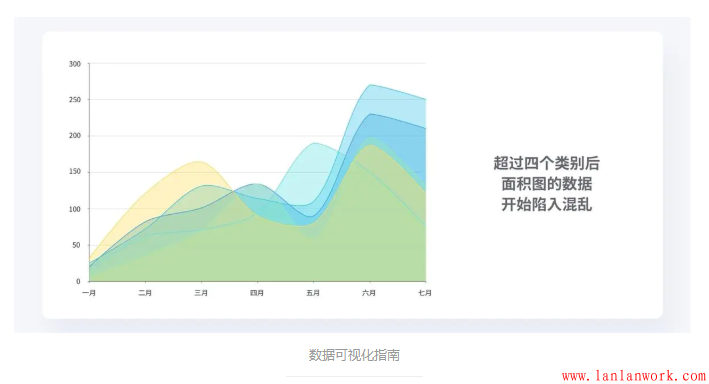 面積圖只適合展現(xiàn)少量的數(shù)據(jù),最多建議不要超過(guò)四個(gè)類別,否則就會(huì)導(dǎo)致非常難以識(shí)別。因此在多個(gè)類別下,要盡量避免使用面積圖。
