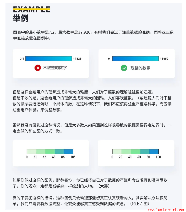 有時(shí)我們甚至可以更簡(jiǎn)約的表示圖例,當(dāng)你只想表達(dá)一個(gè)漸進(jìn)的過(guò)程,24和55之間的差異并不重要,觀眾只需要知道后者比前者大即可。在這種情況下,我們可以嘗試只標(biāo)記出圖例的最大值和最小值,而不必要標(biāo)記出每個(gè)邊界或者顏色,這樣可以給觀眾減少不必要的信息負(fù)擔(dān)。