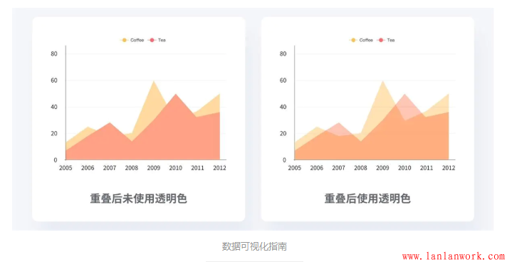 當(dāng)圖表中要展示多組數(shù)據(jù)時(shí),最好保證所有的數(shù)據(jù)都不重疊,這樣才可以更好的展示數(shù)據(jù)。如果無(wú)法避免重疊,則應(yīng)該適當(dāng)?shù)脑O(shè)置顏色和透明度,使得重疊的區(qū)域變得更加易讀。