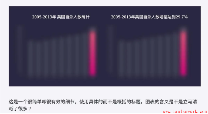 標(biāo)題應(yīng)該是一個(gè)結(jié)論,是你希望面試官?gòu)闹蝎@得的信息(有意義并且有趣的部分),而不僅僅是對(duì)圖表展示內(nèi)容的概括(即無(wú)意義且無(wú)趣的部分)。