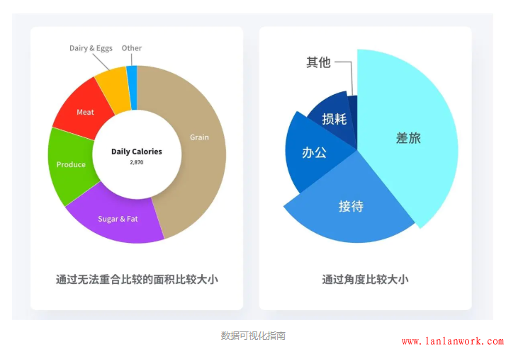 例如上面左圖,我們很難去比較每日從肉類(Meat)中攝入的卡路里與從糖類(Sugar&Fat)中攝入的卡路里數(shù)量的比例。人眼的直覺(jué)中,糖類與肉類的比例應(yīng)該在2:1左右,但實(shí)際的比例卻是1.5:1。