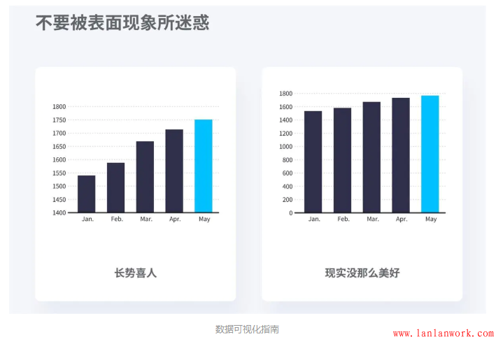 這也同時(shí)提醒我們要注意,在觀看別人的圖表時(shí),僅僅觀看柱狀圖的高低趨勢(shì)往往不能得出正確結(jié)論,需要注意坐標(biāo)軸起始位置有沒(méi)有被人做過(guò)虛假處理。