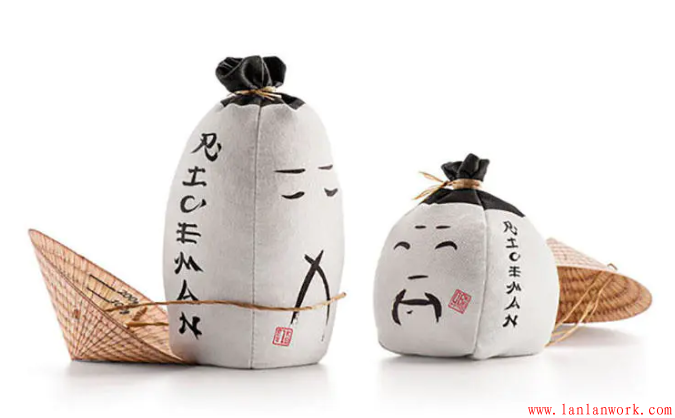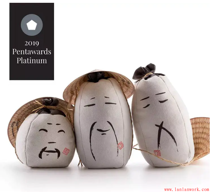 包裝外形以亞洲稻農戴蓑帽的傳統形象為原型,圓錐形帽子紙盒蓋子內側則巧妙與標記測量米量的米杯結合,實用又環保。兩種不同尺寸的袋子分別裝盛不同的大米類型:短粒米為小袋子,長粒米為高袋子。