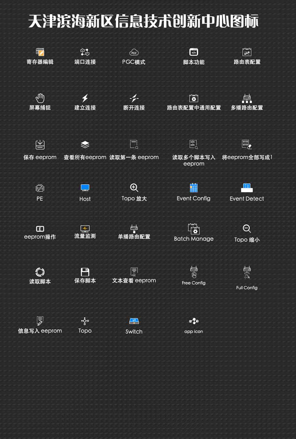 蘇野芯片高速串行rapidio芯片配置軟件是一款芯片功能監測,配置及調試的軟件,其復雜程度高,專業性極強,需要反復與客戶溝通,理解背后含義才能設計出符合產品特征的圖標。